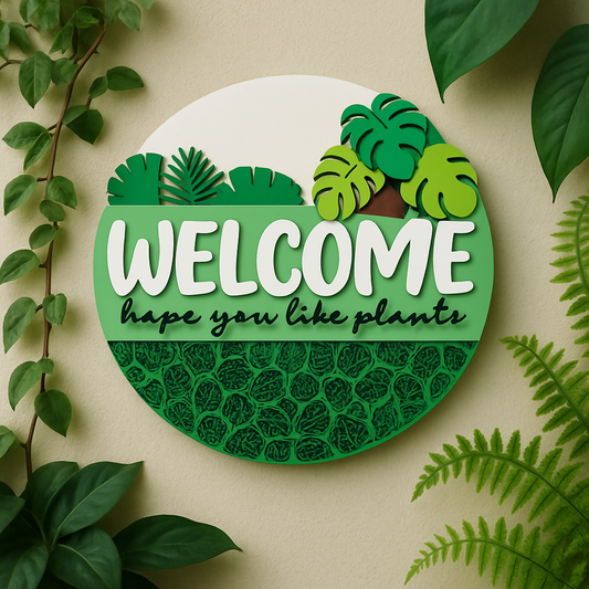 Welcome Plant Lovers Door Hanger – 3D Laser Cut Sign with Tropical Leaf Design – Indoor/Outdoor Greenery Decor
