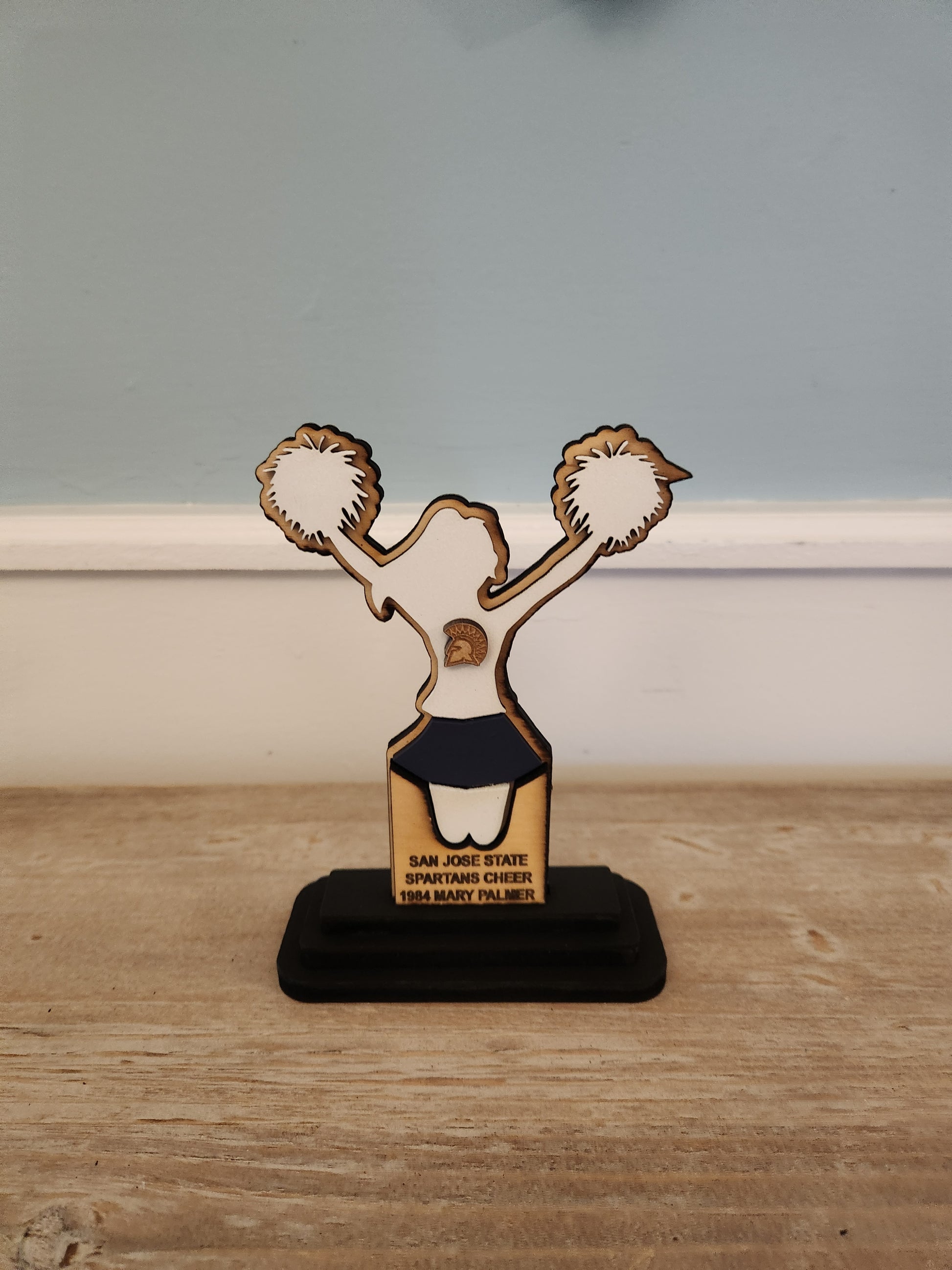 Celebrate your cheerleading team's achievements with this beautifully crafted personalized trophy memorabilia from BrAvEl WoodWorx. Perfect for recognizing outstanding cheerleaders, team spirit, and memorable moments.